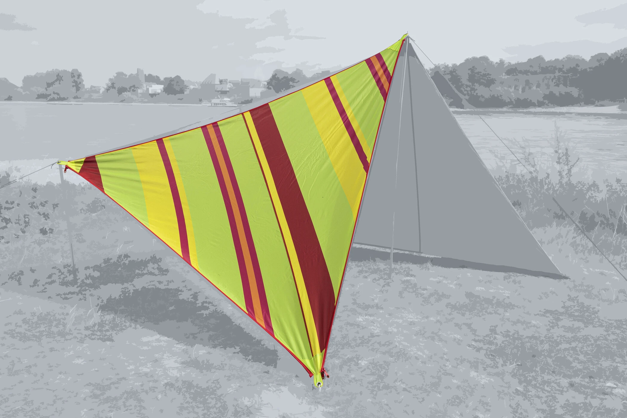 Het doek is modulair, functioneel, variabel, gemakkelijk te hanteren en licht in gewicht. Gemaakt van een robuust 150D polyester met een waterkolom van 1.500 mm en een UV-bescherming van 60 volgens standaard 801, is het handig verpakt in een koorddraagtas in bijpassende kleuren.