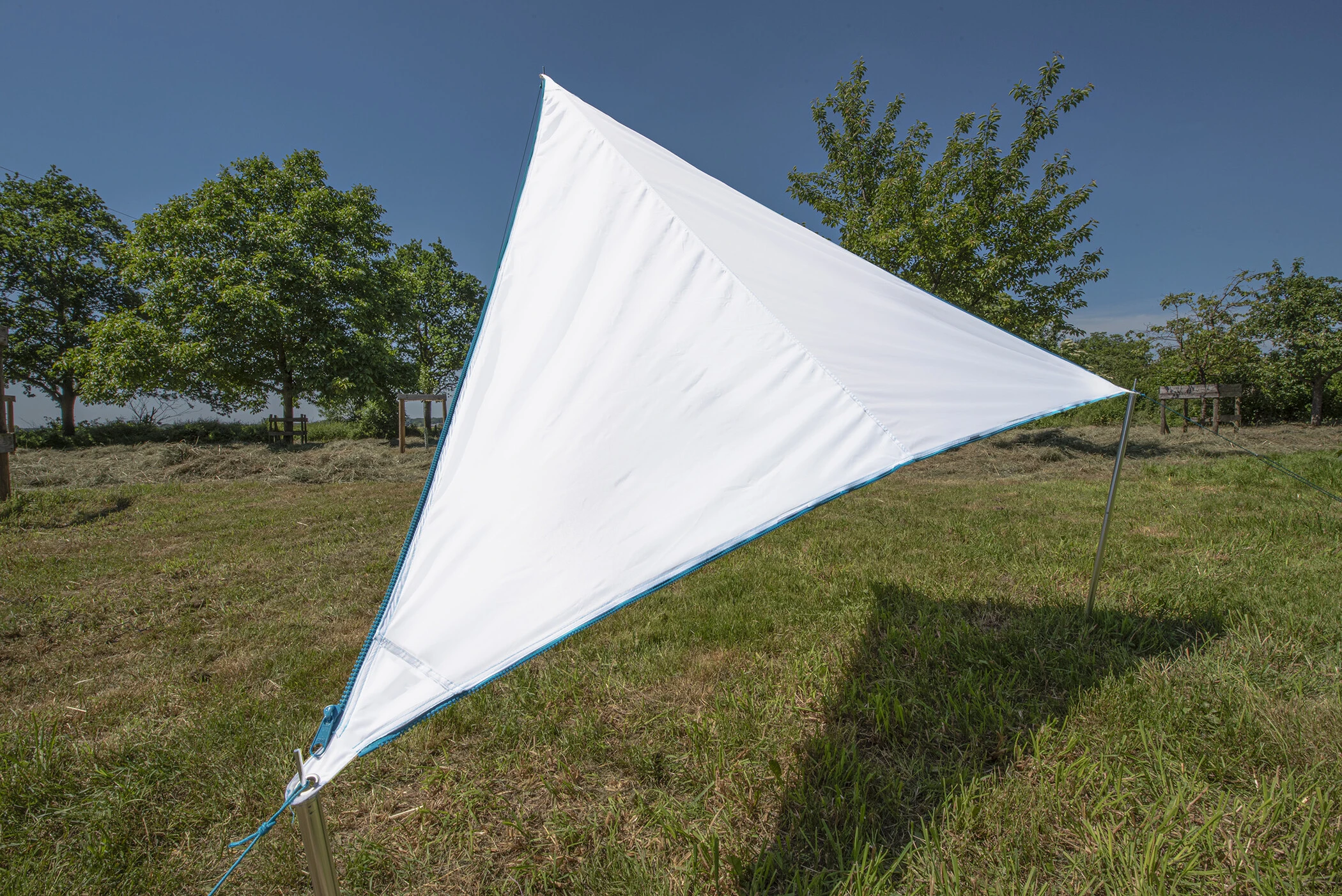 Het doek is modulair, functioneel, variabel, gemakkelijk te hanteren en licht in gewicht. Gemaakt van een robuust 150D polyester met een waterkolom van 1.500 mm en een UV-bescherming van 60 volgens standaard 801, is het handig verpakt in een koorddraagtas in bijpassende kleuren.
