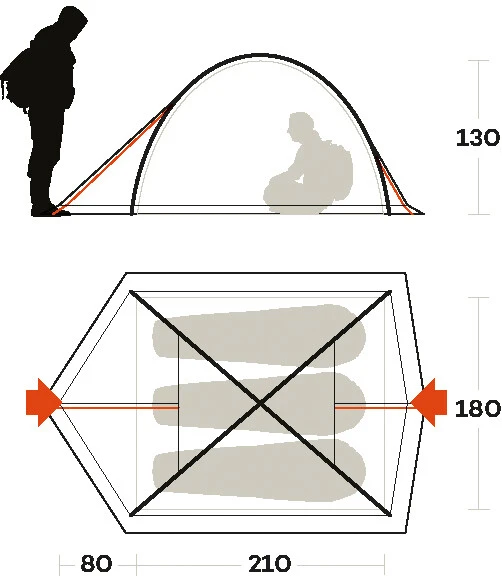 - ophefbare sneeuwflap voor een gegarandeerde uitstekende ventilatie (bij opgerolde tent) of ter bescherming van de binnenkant van de tent bij slecht weer (bij uitgerolde tent)