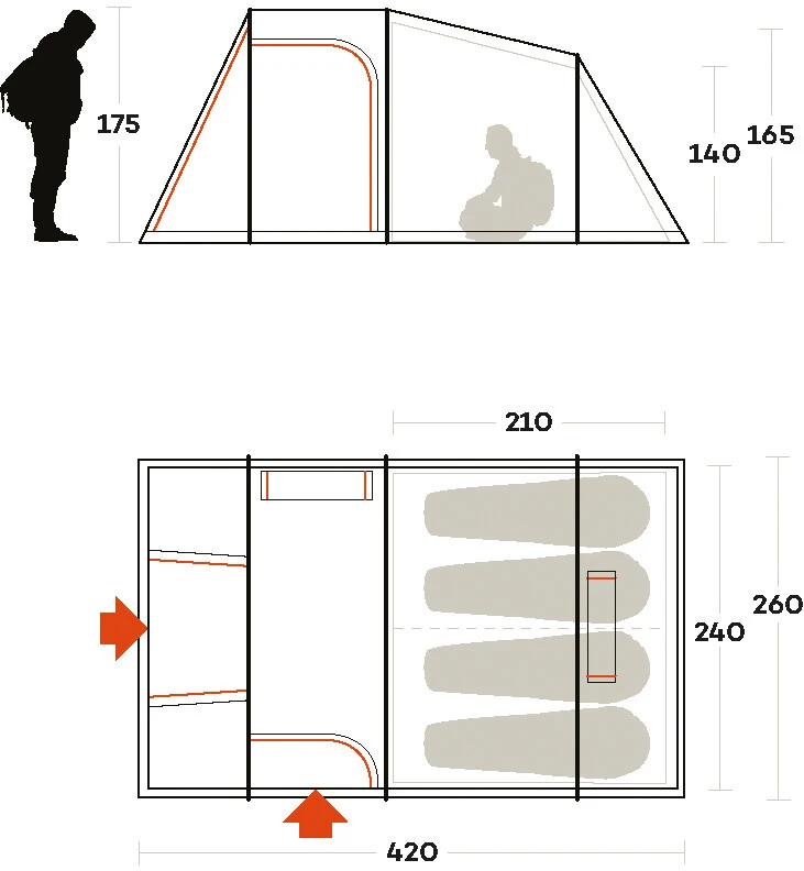 - Binnentent vloermateriaal: 70D Polyester, 80 g/m² waterdicht tot 2.500 mm