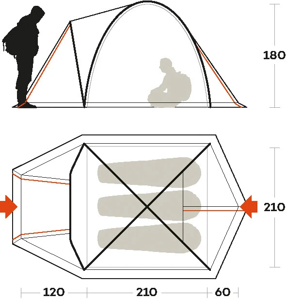- ophefbare sneeuwflap voor een gegarandeerde uitstekende ventilatie (bij opgerolde tent) of ter bescherming van de binnenkant van de tent bij slecht weer (bij uitgerolde tent)