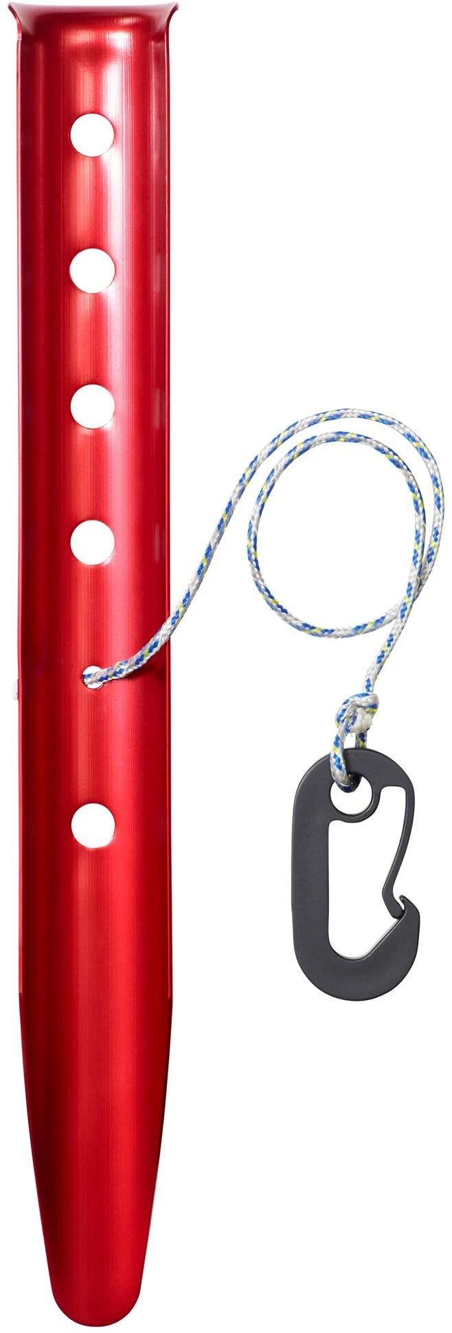 Lange, brede tentharing, die gemakkelijk kan worden bevestigd in sneeuw en zand wanneer conventionele tentharingen weinig ondersteuning bieden. Gemaakt van licht aluminium. Gekleurd in zeer zichtbaar rood. Een duurzame Dyneema-lijn met een robuuste kunststof karabijnhaak is bevestigd aan de tentharing voor het vasthaken aan de scheerlijnen of grondlussen van de tent. De gaten in de pen verminderen het gewicht en maken verdere bevestigingsvarianten mogelijk.