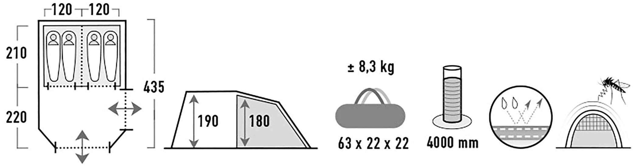 Familie tunneltent met stahoogte. De veranda dient als leefruimte en opslagruimte voor kampeeruitrusting. 2 ingangen voor flexibele opening en meer bewegingsvrijheid. Gaasvenster met afdekflap voor optimale ventilatie. Verwijderbare, eenvoudig te reinigen tentvloer. De septische strips houden vuil en vocht buiten. Ondoorzichtige transparante folieramen brengen licht in de tent. 3 permanente ventilatieopeningen ventileren de tent voor een goede nachtrust en moeten altijd open staan. De buitentent wordt eerst opgezet en de binnentent wordt in de tweede stap opgehangen. Bij regenachtig weer is de binnentent beschermd en droog opgezet. Zeer stabiele stalen grondpennen met een diameter van 5 mm buigen zelfs op harde ondergrond niet door. De naden zijn waterdicht afgedicht door middel van naadtape en zorgen voor een betere scheurvastheid van de naad. Verduisterde binnentent met 2 ingangen en uitneembare scheidingswand. Vario Vent Control Systeem. De ingang met muskietennet houdt vervelend ongedierte op afstand en kan, afhankelijk van het klimaat, gemakkelijk van binnenuit variabel worden bediend. De afdekflap wordt gewoon in een zakje opgeborgen. Het vervelende oprollen behoort tot het verleden. De binnentent wordt geklimatiseerd door continue ventilatoren. Praktische organisers en binnentent zakken voor keukengerei. 2 lamphouders voor een camping lantaarn of zaklamp ronden het comfort af. De Ancona 4.0 biedt plaats aan maximaal 4 personen en is bij uitstek geschikt voor een vakantie met familie of vrienden.