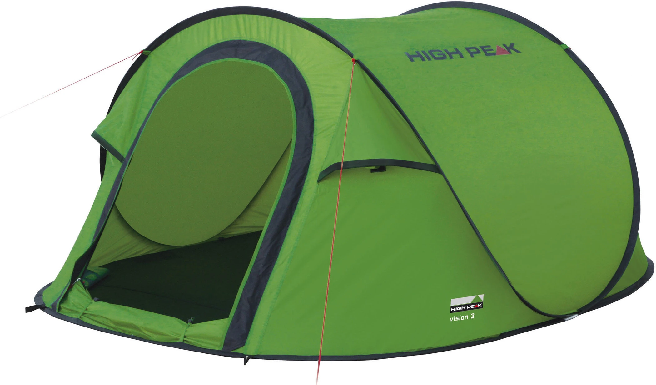 De Vision 3 biedt ruimte voor 2 – 3 personen en is een must voor rockfestivals. Pop-up single skin ontwerp. Pop-up tent met voorgeïnstalleerde stokken. Het brede lichaamsontwerp geeft een ontspannen gevoel in de tent. Drie all-weather openingen. De ventilatieopeningen blijven altijd open zodat de tent volledig functioneel blijft. De ingang met muggenraam houdt ongedierte weg. Tijdens een warme dag raadt High Peak aan om de stroomvoorziening van de deur te gebruiken voor extra ventilatie. Roldeur met snelsluitsysteem. Lamphouder en praktische binnenzakken. Waterdichte naden, verzegeld met plakband.