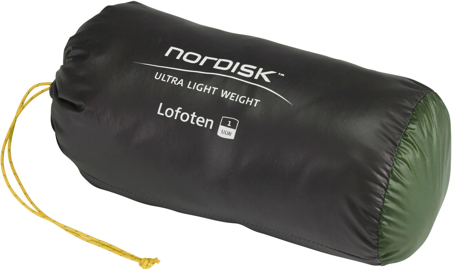 7D met een gewicht van slechts 26 g/m2 en een draadtelling van 580 g/m2. De 3-laagse siliconen coating aan beide zijden zorgt voor een hoge weerstand en waterafstotende eigenschappen, en het nieuwe Nordisk Flex-Rope Suspension System zorgt ook voor een hoge flexibiliteit en sterkte. Lofoten kunnen worden omgetoverd van een 1-persoonstent tot een 2-persoonstent door eenvoudigweg