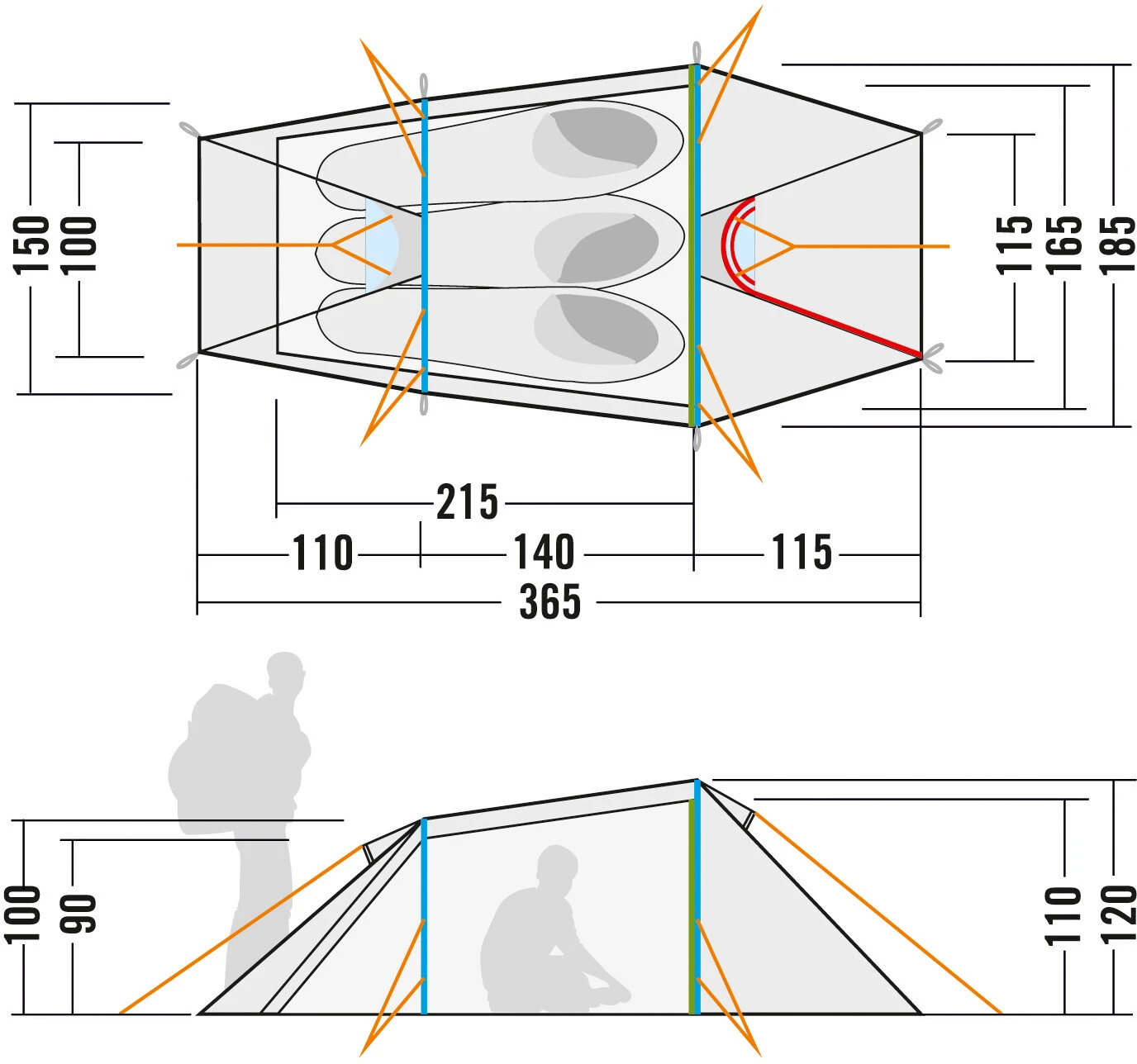 - Tunneltent met twee bogen, de stokken van de achtertent zijn ingekort