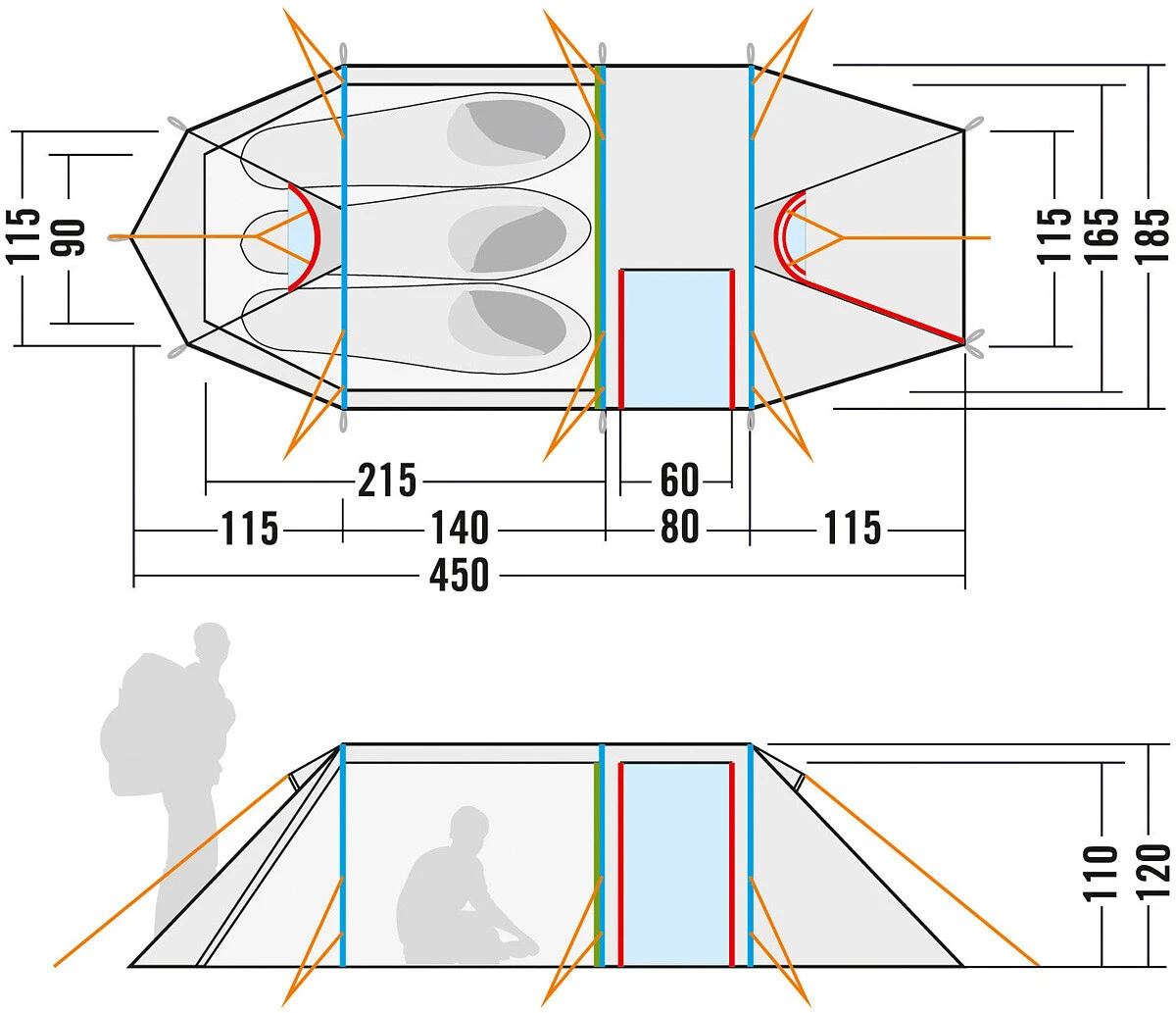- geoptimaliseerde tunneltent met drie boogstokken en grote apsis, voor een optimaal gewicht